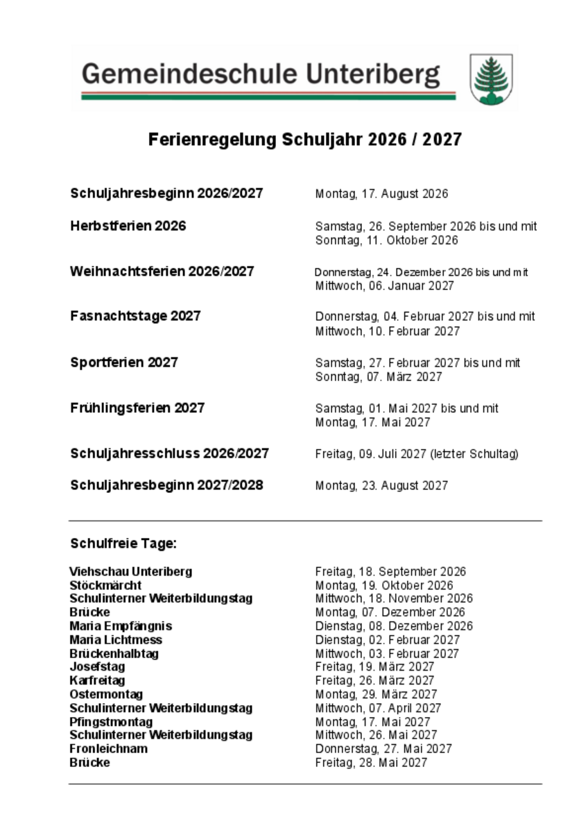Ferienregelung der Gemeindeschule Unteriberg
