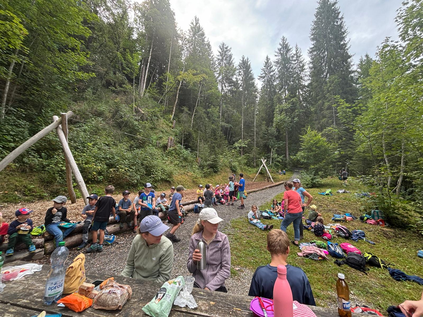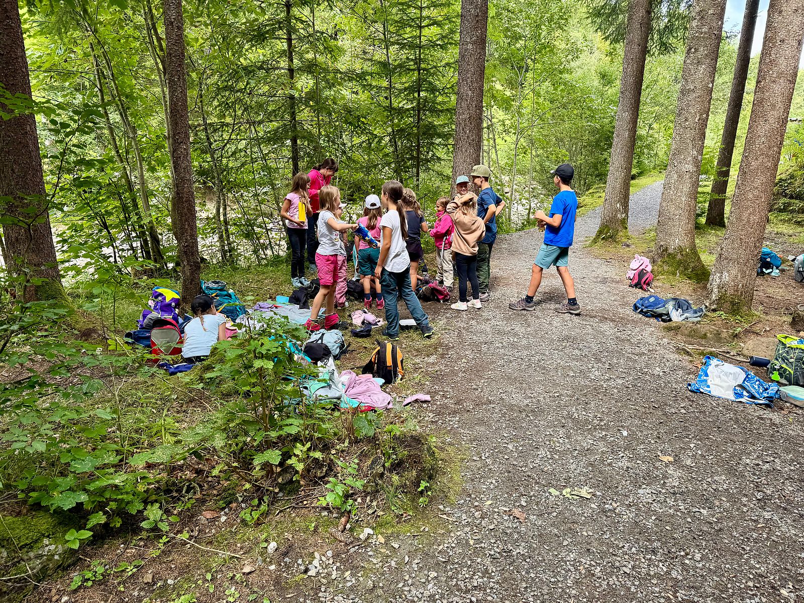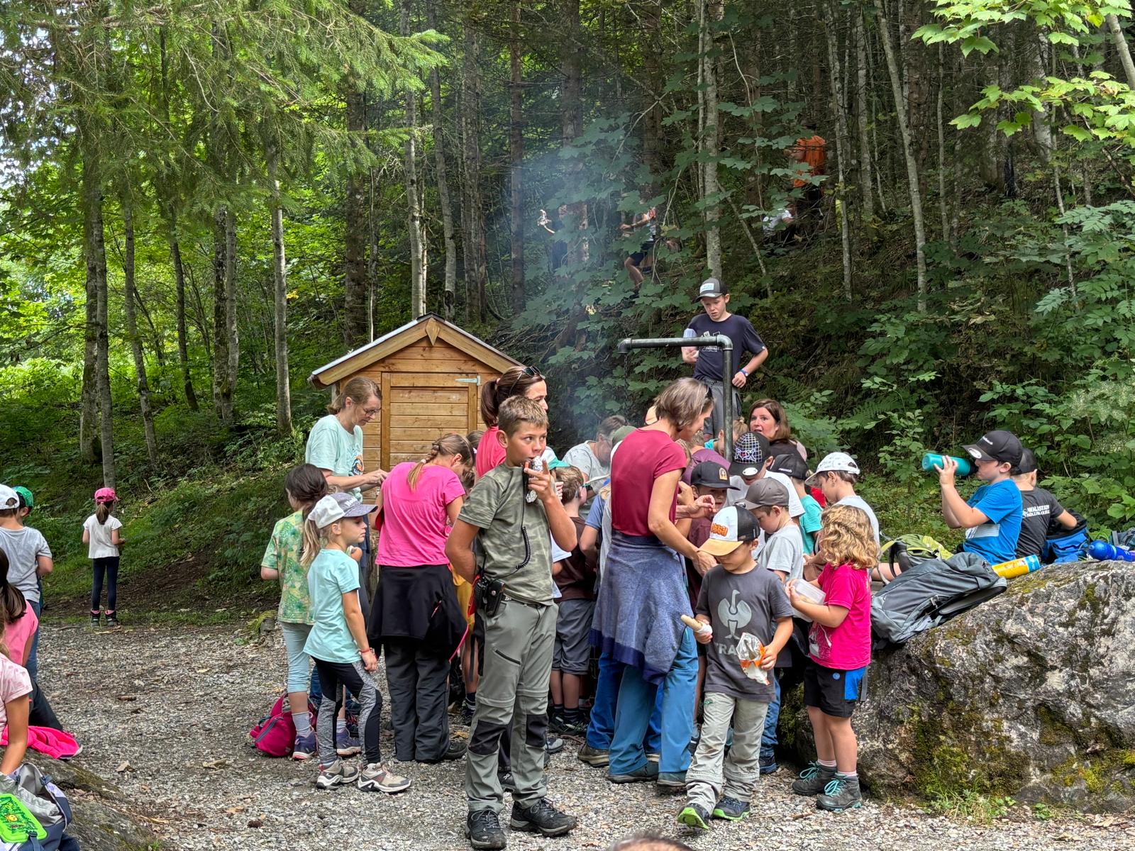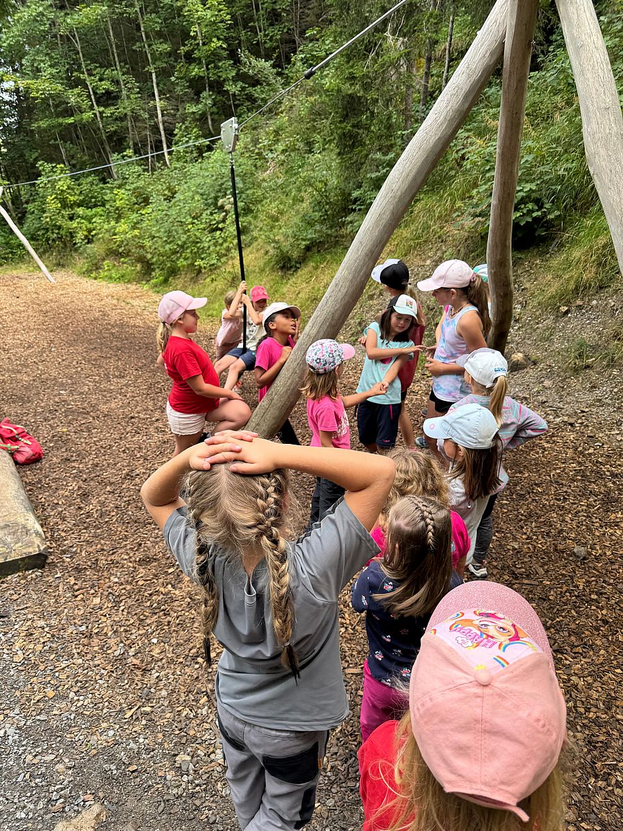 Dort angekommen, wurde die Zeit in vollen Zügen genossen: Die Schülerinnen und Schüler nutzten die Zeit, um im Wald und am Bach zu spielen und sich an der Seilrutsche auszutoben. Die Kinder waren mit Begeisterung dabei – auch wenn einige mit nassen Füssen den Rückweg antreten mussten, tat das der guten Stimmung keinen Abbruch.