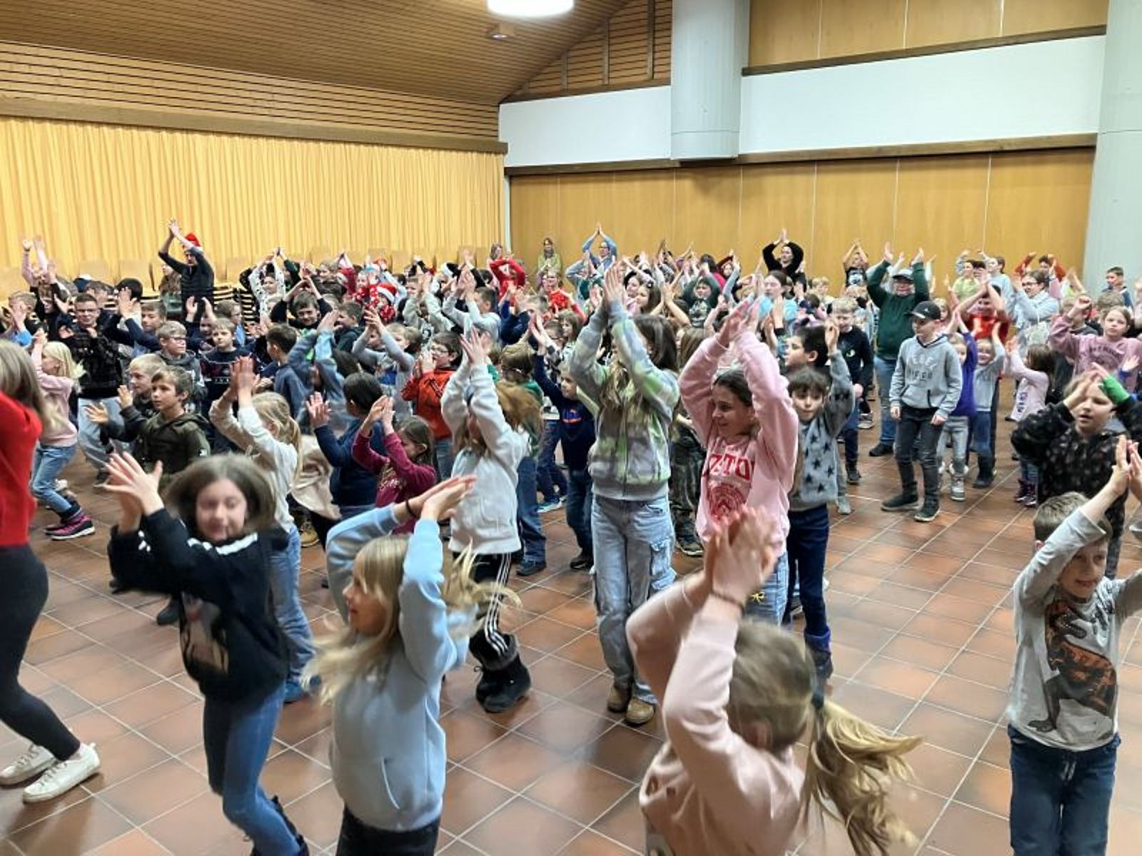 Ein Höhepunkt war der gemeinsame Tanz aller Klassen zum Jahresthema „Achtung – Fertig – Sport“. Zum Schluss wurde mit Orangenpunsch auf die Ferien und das neue Jahr angestossen und es gab für jedes Kind noch ein «Schöggeli» auf den Heimweg – ein süsser Abschluss vor den wohlverdienten Ferien.